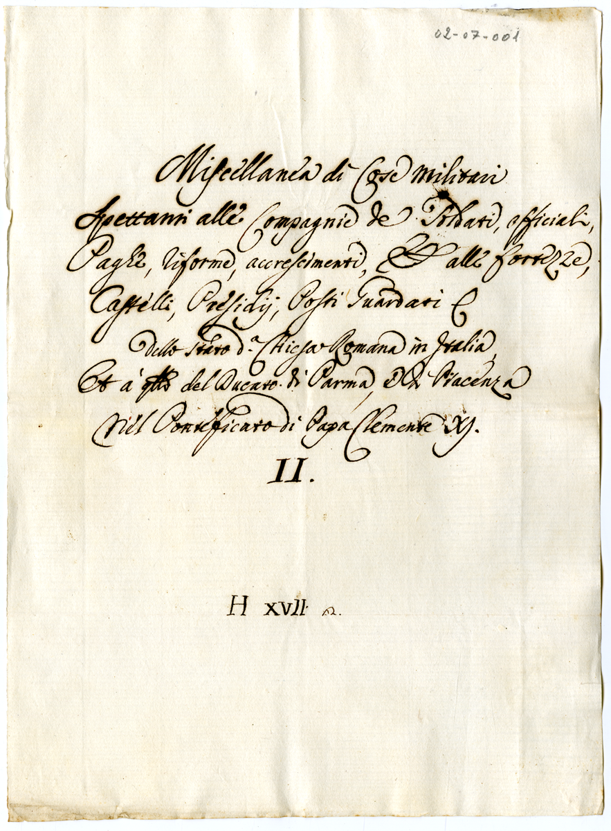 Miscellanea di cose militari spettanti alle Compagnie de Soldati, Officiali, Paghe riforme, accrescimenti, ed alle fortezze, Castelli, Presidii, Posti Guardati dello Stato della Chiesa Romana in Italia, et a quello del Ducato di Parma e di Piacenza nel Pontificato di Papa Clemente XI
