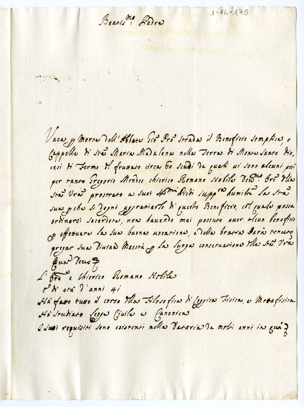 | dc.description | Il chierico Gregorio Mendes chiede che gli venga assegnato il beneficio semplice della cappella di Santa Maria Maddalena di Fermo | |