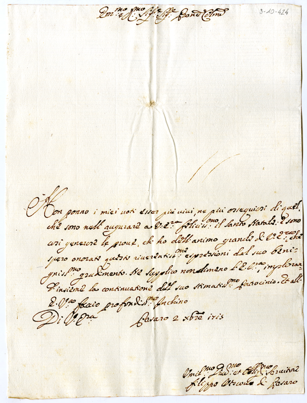 Lettera di Filippo vescovo di Pesaro al cardinale Annibale Albani (1715 dicembre 2)