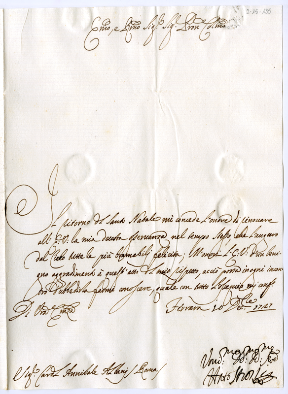 Lettera di Antonio Strozzi al cardinale Annibale Albani (1727 dicembre 10)