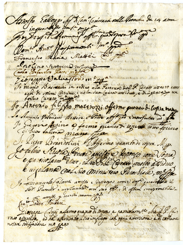 Attestato di ottimi costumi morali e religiosi del curato della parrocchia di Santa Maria in Via di Roma firmato dai parrocchiani (1709 settembre 27)