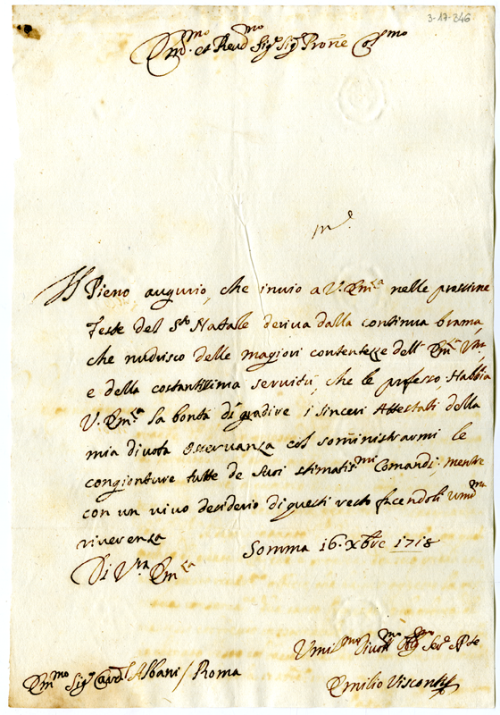 Lettera di Emilio Visconti al cardinale Annibale Albani (1718 dicembre 16)