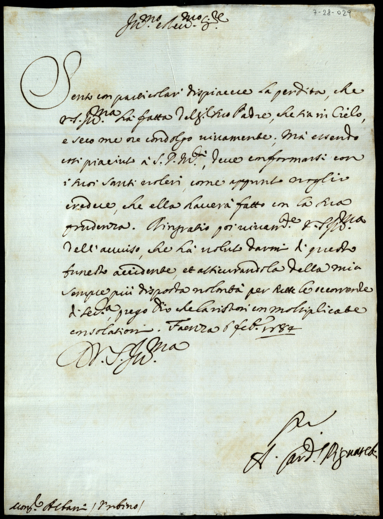 Lettere di personaggi scritte a Monsignor Albani in condoglianza della morte del Signor Carlo suo padre
