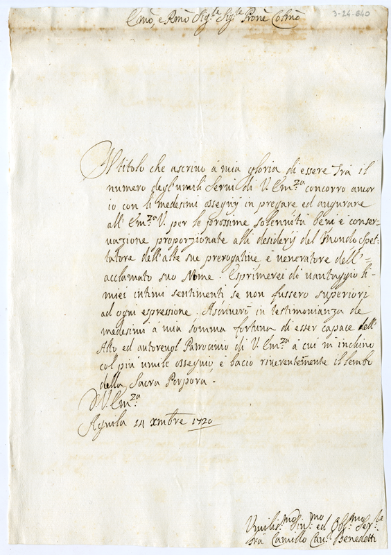 Lettera di Camillo Benedetti al cardinale Annibale Albani (1720 dicembre 14)