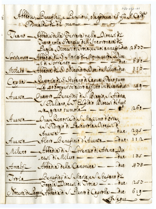 Benefici e pensione che godeva il cardinale Grimaldi nel Regno di Napoli