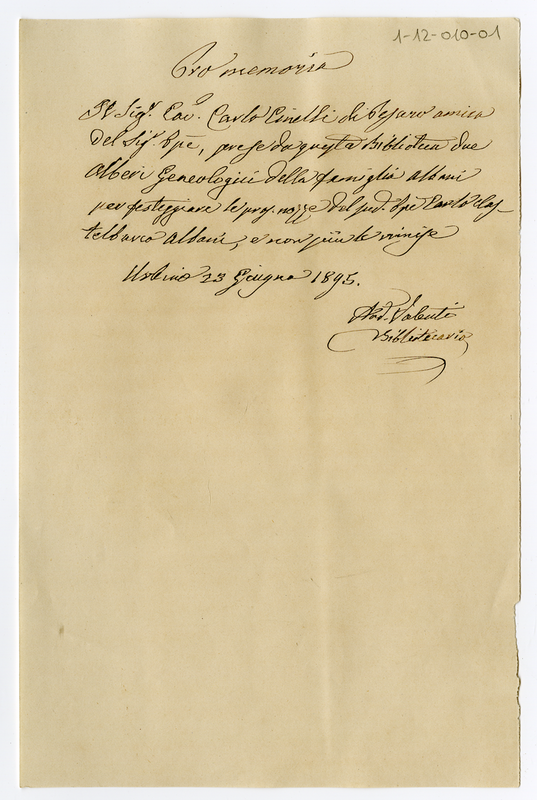 Si nota che Carlo Cinelli di Pesaro ha preso con il permesso della famiglia Albani due alberi genealogici mai più restituiti