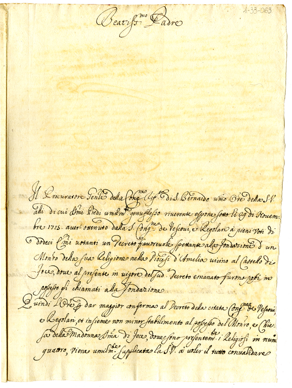 Lettera del priore generale della congregazione riformata di San Bernardo a papa Clemente XI (1700-1721)