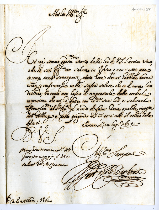 Lettera del cardinale Carlo Barberini a Carlo Albani (1674 luglio 28)