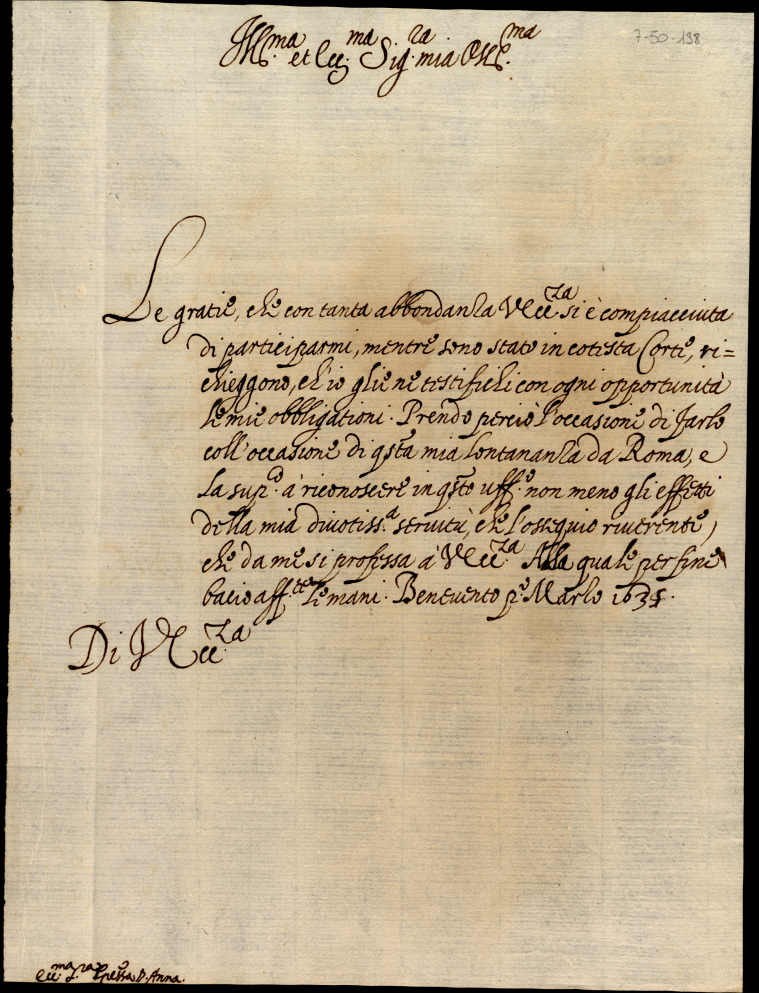 Minute di lettere latine, italiane e francesi scritte a diversi da Monsignor Annibale Albani di complimento, negozio