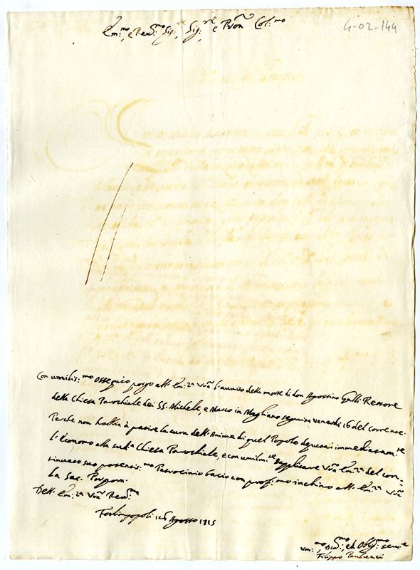 Lettera di Filippo Paolucci al Cardinale Annibale Albani (1715 agosto 18)
