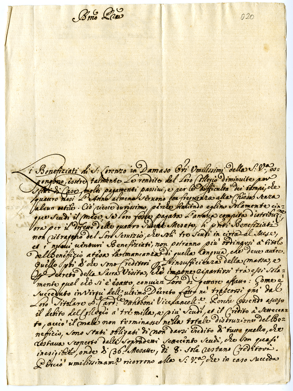 I padri di San Lorenzo in Damaso informano il pontefice delle difficoltà economiche