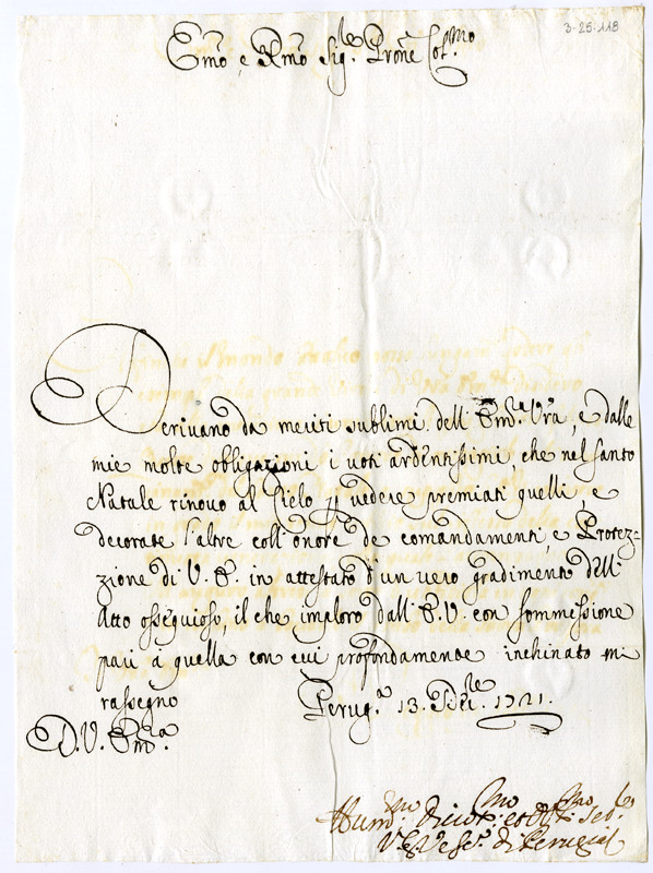 Lettera di Vitale Giuseppe vescovo di Perugia al cardinale Annibale Albani (1721 dicembre 13)