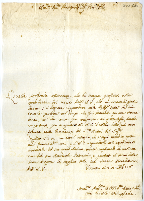 Lettera di fra Nicolò Meneghini al cardinale Annibale Albani (1716 dicembre 11)