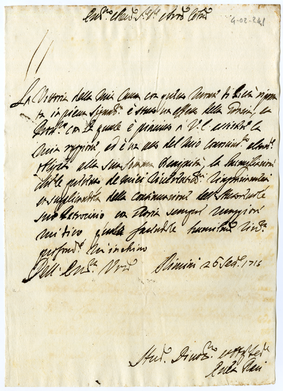 Lettera di Enea Rasi al Cardinale Annibale Albani (1715 settembre 26)