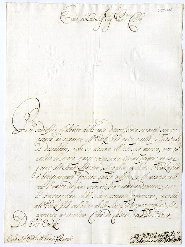 Lettera di Luca Antonio vescovo di Città di Castello al cardinale Annibale Albani (1714 dicembre 20)