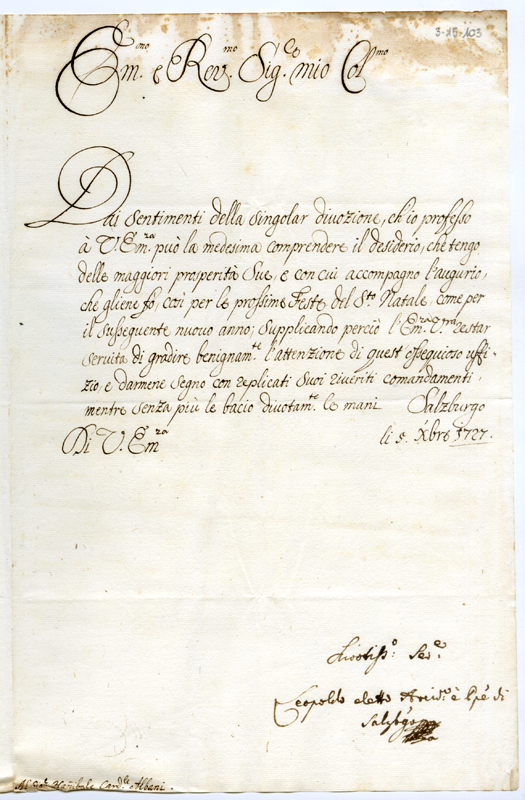 Lettera di Leopoldo arcivescovo di Salisburgo al cardinale Annibale Albani (1727 dicembre 5)