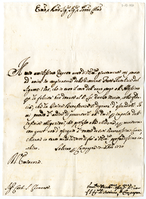 Lettera di Francesco Saverio vescovo di Satriano e Campagna al cardinale Annibale Albani (1730 dicembre 7)