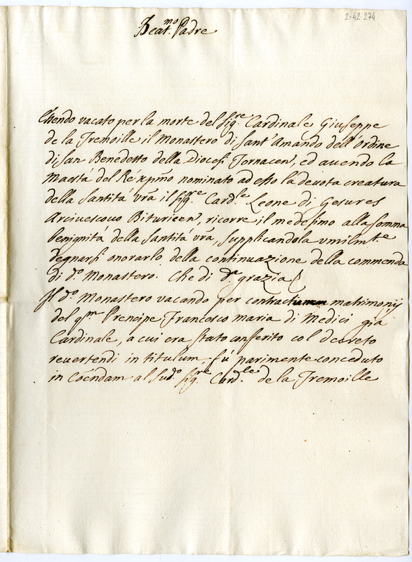 Chiede la continuazione della commenda del monastero benedettino di Sant'Amando vacato per morte del cardinale de la Tremoille