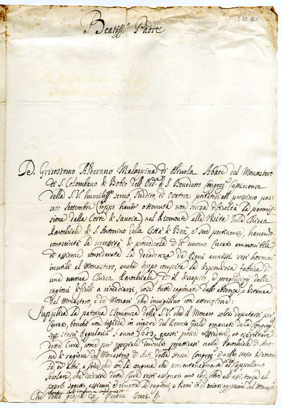 Lettera di Crisostomo Alderano Malaspina di Olivola abate del monastero di Bobbio a papa Clemente XI (1700-1721)