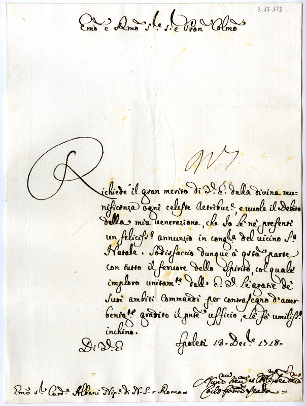 Lettera di Carlo Francesco Spada al cardinale Annibale Albani (1718 dicembre 13)