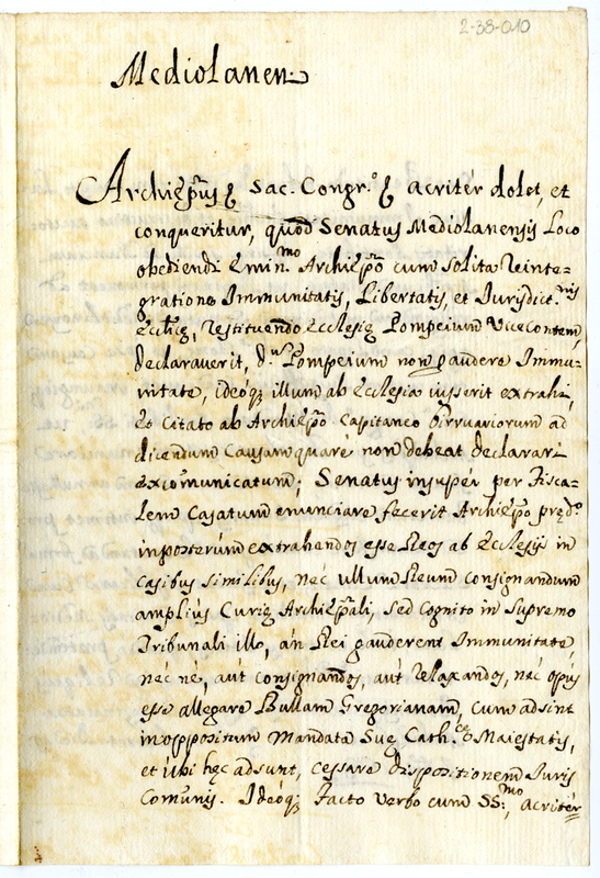 Nota di violazione dell'immunità ecclesiastica da parte del senato di Milano, denunce dell'arcivescovo (1700-1721)