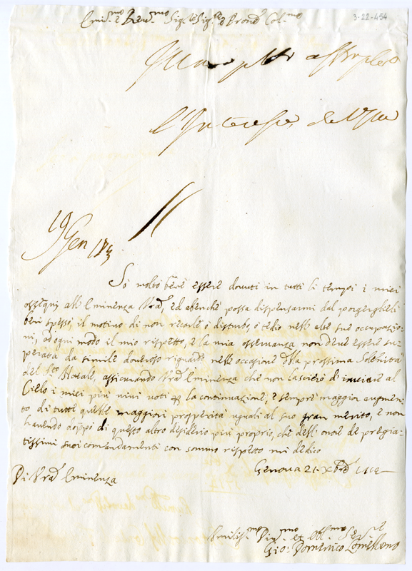 Lettera di Giovanni Domenico Lomellino al cardinale Annibale Albani (1714 dicembre 21)