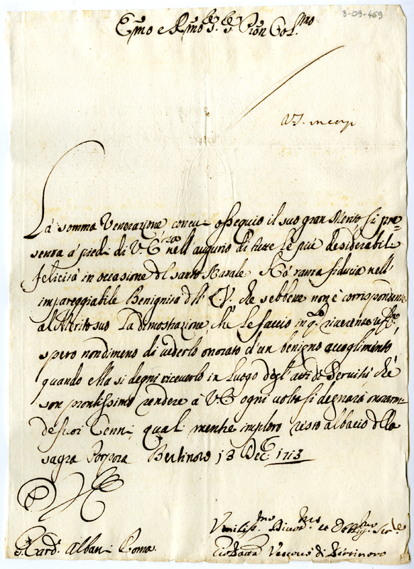 Lettera di Giovanni Battista vescovo di Bertinoro al cardinale Annibale Albani (1713 dicembre 13)