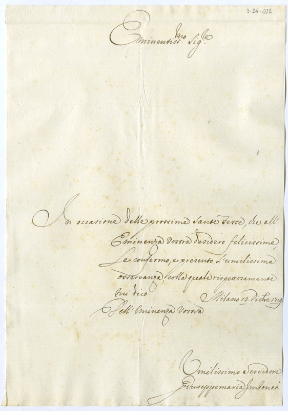 Lettera di Giuseppe Maria Imbonati al cardinale Annibale Albani (1719 dicembre 13)
