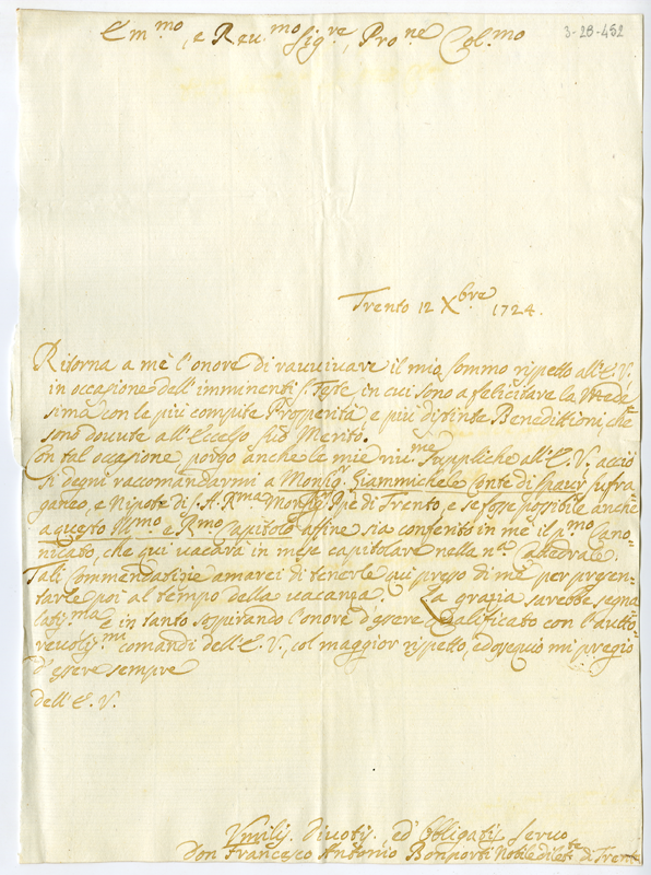 Lettera di don Francesco Antonio Bonporti al cardinale Annibale Albani (1724 dicembre 12)