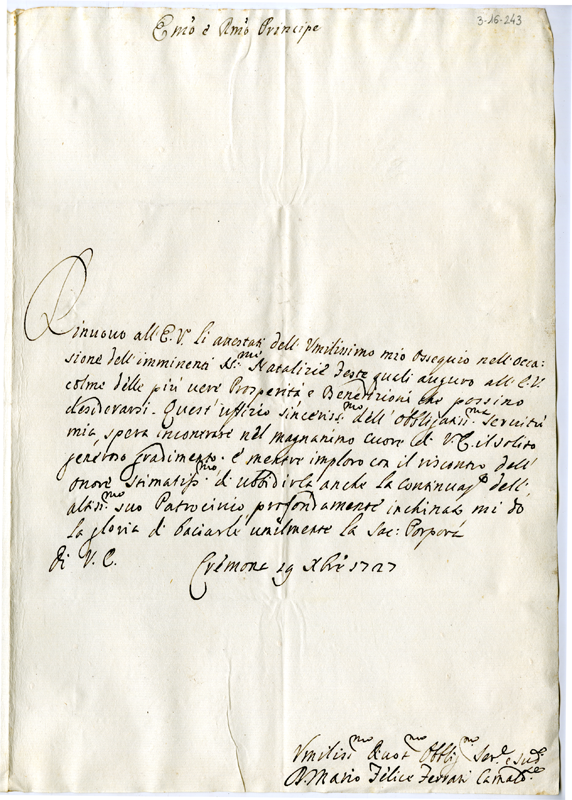 Lettera di don Mario Felice Ferrari al cardinale Annibale Albani (1727 dicembre 19)