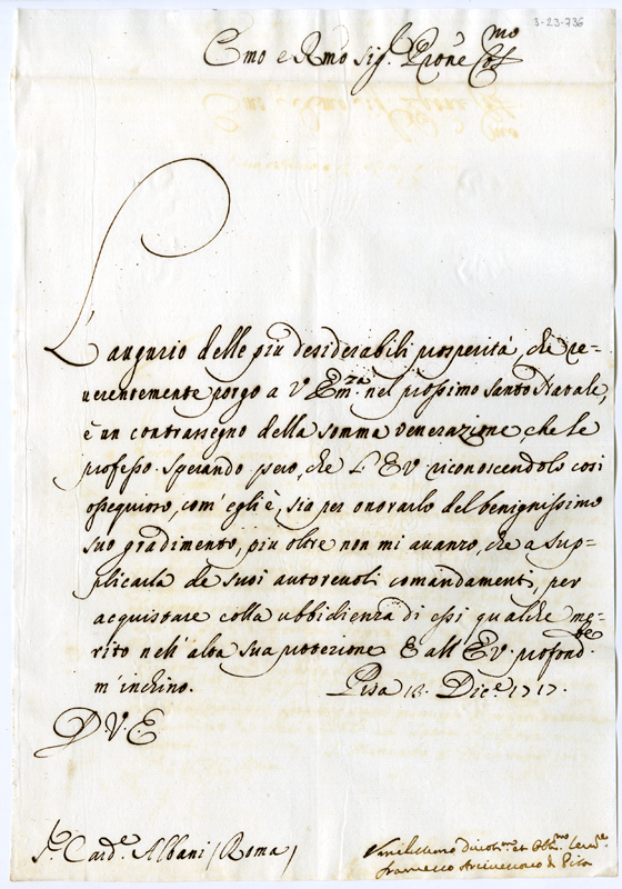 Lettera di Francesco arcivescovo di Pisa al cardinale Annibale Albani (1717 dicembre 13)