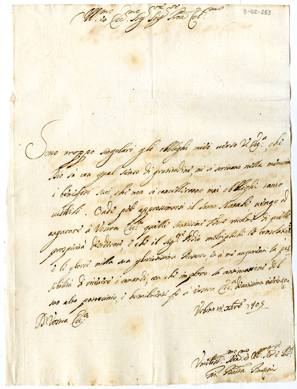 Lettera di Giovanni Battista Pinzoni ad Annibale Albani (1705 dicembre 18)