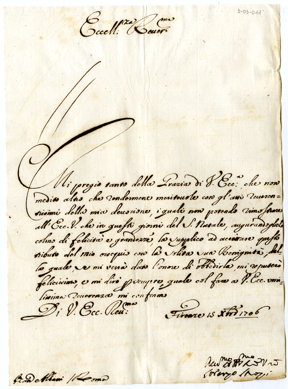 Lettera di Lorenzo Strozzi ad Annibale Albani (1706 dicembre 15)