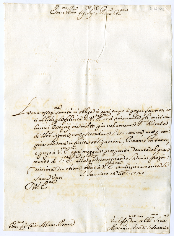 Lettera di Alessandro vescovo di San Severino al cardinale Annibale Albani (1720 dicembre 16)