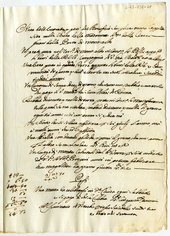 Nota dell'entrata e pesi del Beneficio semplice ovvero Cappella sita nella Chiesa della Madonna Santissima della Cava fuori della porta di Montalto (1698)