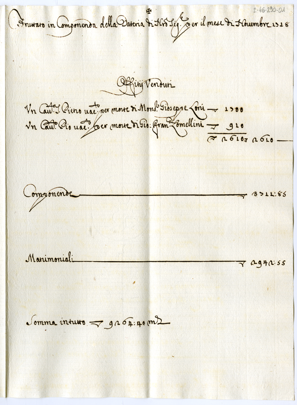 Fruttato in Componenda della Dateria di Nostro Signore del mese di Novembre 1718