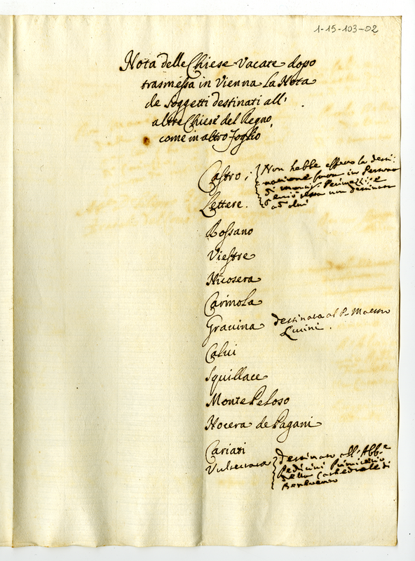 Nota delle chiese vacate dopo trasmessa in Vienna la nota de soggetti destinati all'altre chiese del regno, come in altro foglio