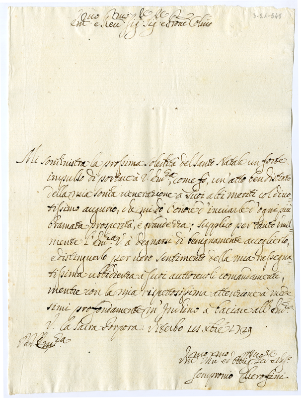 Lettera di Sempronio Cherofini al cardinale Annibale Albani (1729 dicembre 18)