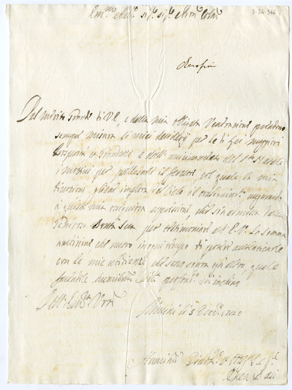 Lettera di Enea Rasi al cardinale Annibale Albani (1720 dicembre 5)