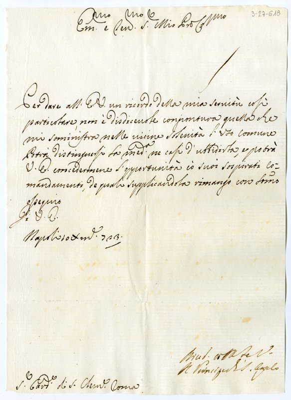 Lettera del principe di Sant'Angelo al cardinale Annibale Albani (1723 dicembre 10)