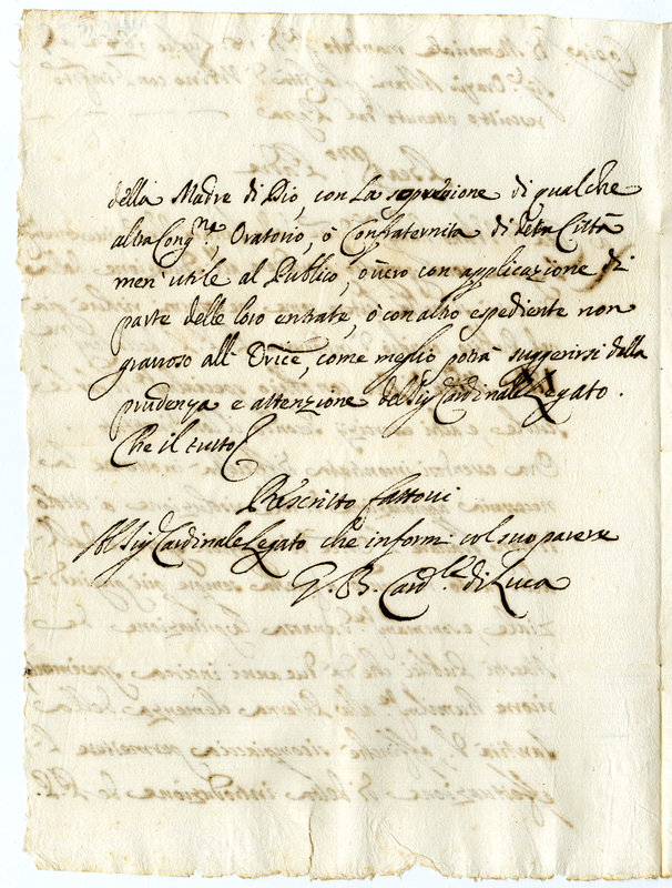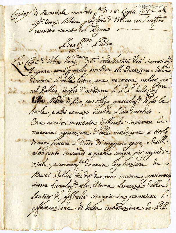 Lettera al Papa perchè introduca in Urbino la Congregazione dei Padri della Madre di Dio, con la soppressione di qualche altra Congregazione, Oratorio o Confraternita meno utile. Rescritto Pontificio: Il Cardinale Legato dia il suo parrere al Cardinale de Luca