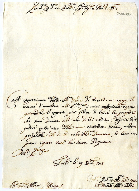 Lettera di Giovanni Battista abbate Gaddi al cardinale Annibale Albani (1715 dicembre 19)