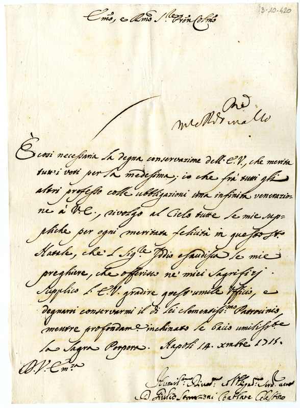 Lettera di Giulio Stonzioni al cardinale Annibale Albani (1715 dicembre 14)