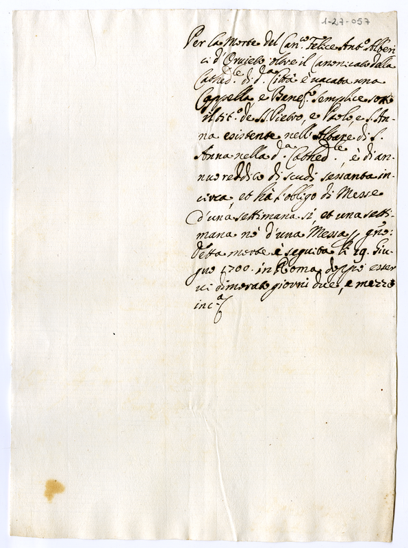 Sui benefici goduti dal defunto Canonico Felice Antonio Alberici (1700 giugno 19)