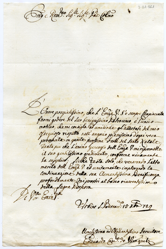 Lettera di Edouardo cavaliere de Winquitz al cardinale Annibale Albani (1729 dicembre 17)