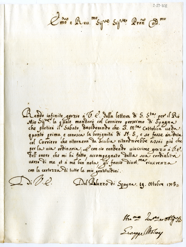 Lettera di Giuseppe Molines ad un cardinale (1713 ottobre 19)