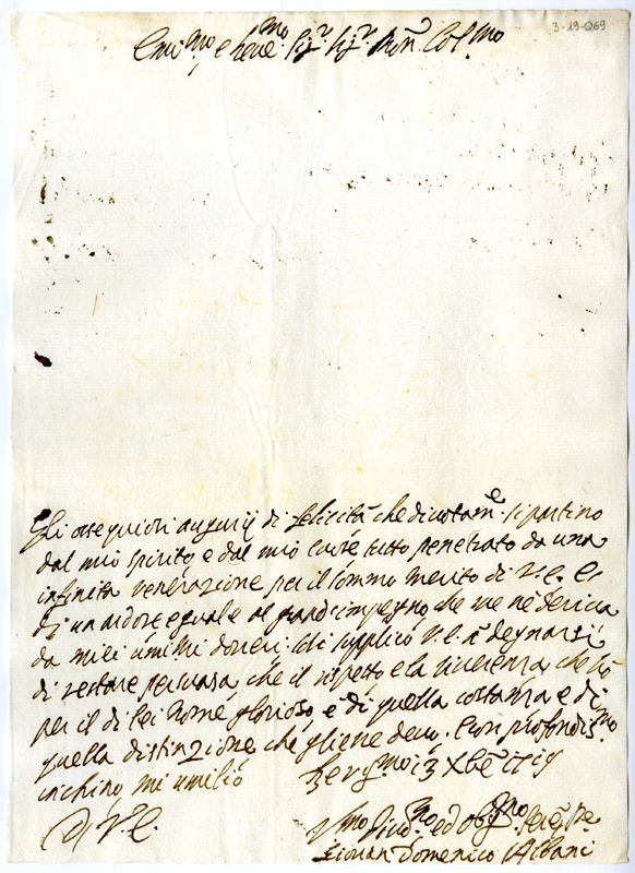Lettera di Giovan Domenico Albani ad Annibale Albani (1719 dicembre 13)