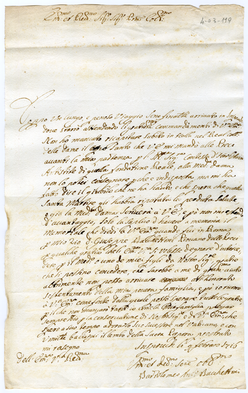 Lettera di Bartolomeo Antonio Bacchettoni al Cardinale Annibale Albani (1716 febbraio 9)