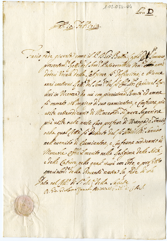 Requisiti di Don Giovanni Battista Laghi religioso somasco, rilasciati da Giovanni Girolamo Zanchi