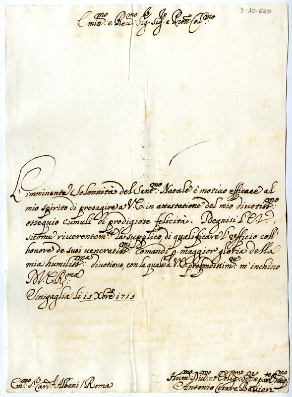 Lettera di Antonio Cesare Bavieri al cardinale Annibale Albani (1715 dicembre 15)